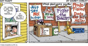 Get Fuzzy is an American daily comic strip written and drawn by Darby Conley. The strip features the adventures of Boston advertising executive Rob Wilco and his two anthropomorphic pets: dog Satchel Pooch and cat Bucky Katt